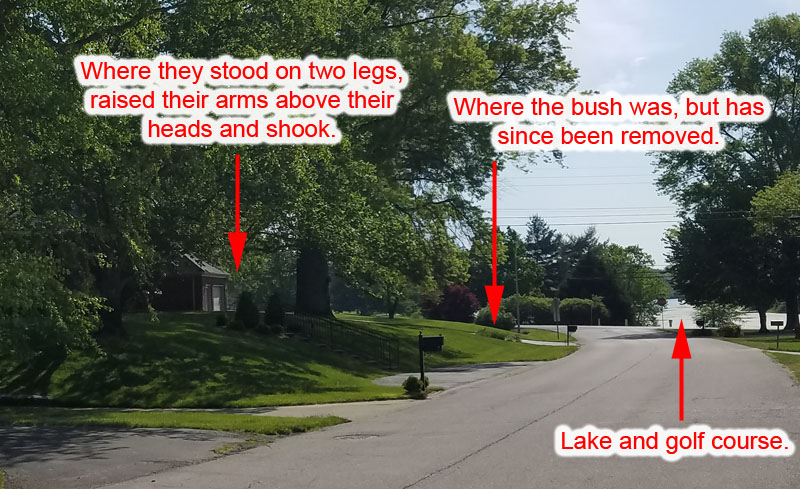 From Pam’s position on the street, the creatures were approximately 75 yards away. A golf course with a lake is directly across the street from the sighting. A tree-lined creek runs behind the golf course which connects to less populated areas. As the crow flies, there have been Bigfoot sightings only 9 miles north in Smithfield on 9-27-13 and only 12 miles south in 2012 was the location of the possible Waddy Werewolf attacks which mauled livestock on Ditto Road. Bigfoots will travel on all fours, especially juveniles. Some might travel as quadrupeds to look less obvious. The creatures in this encounter could have been Bigfoots, or dogmen, or perhaps something else? The witness was very sincere, credible and consistent with her testimony and had no apparent motive to lie. Actually she has more of a risk to be ridiculed. She was brave to share her encounter and I thanked her. She thanked me as well, for believing her, that she’s not crazy. Photos from investigation below.